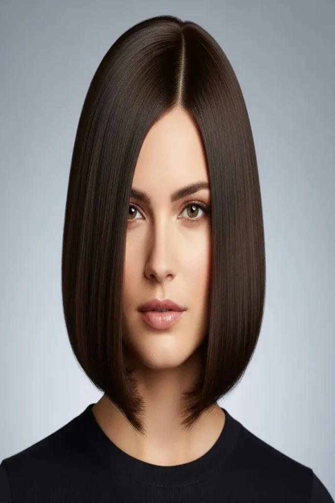 This version is particularly flattering for oval and heart-shaped faces, as it elongates the face and adds an elegant silhouette. Styled straight, it’s minimalistic and chic, while adding waves can soften the overall appearance without losing its blunt appeal.