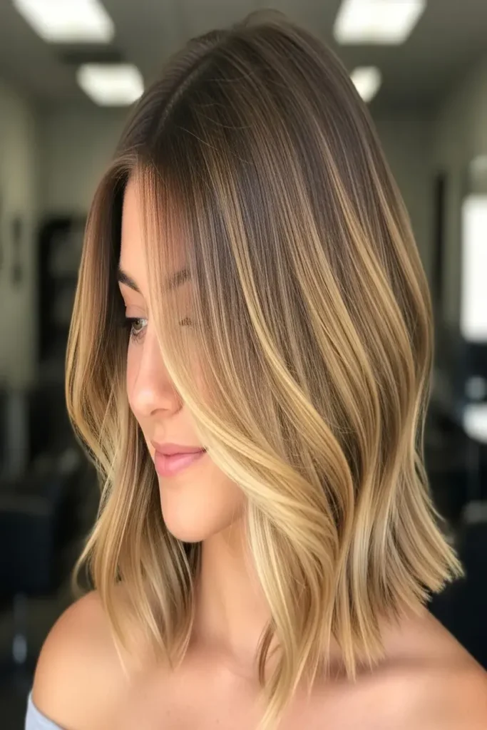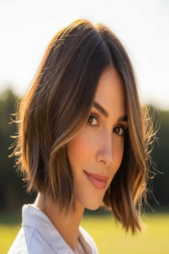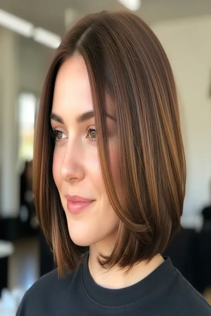 Balayage adds depth, warmth, and modern flair to blunt shoulder length haircuts. The seamless color blend enhances the haircut’s sharpness while keeping it dynamic and fresh. It’s a perfect way to personalize your cut.