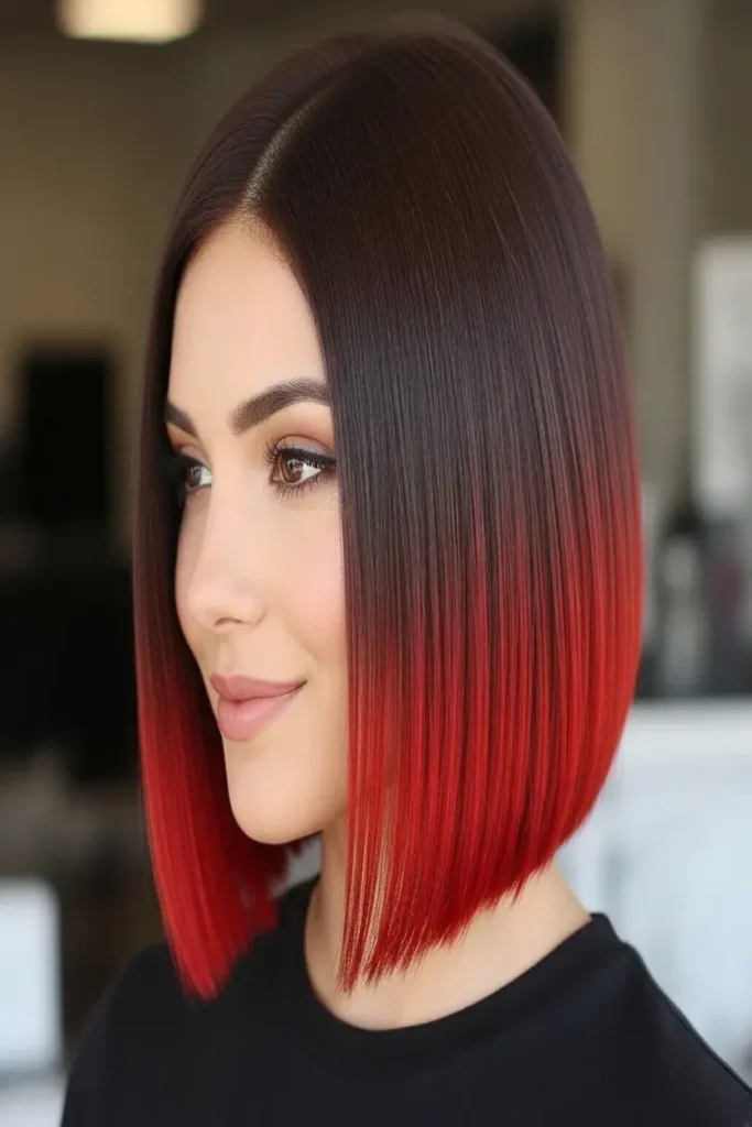Ombre coloring enhances blunt shoulder length cuts with a dramatic gradient effect. Darker roots blend into lighter ends, adding depth and contrast to the haircut’s simplicity.