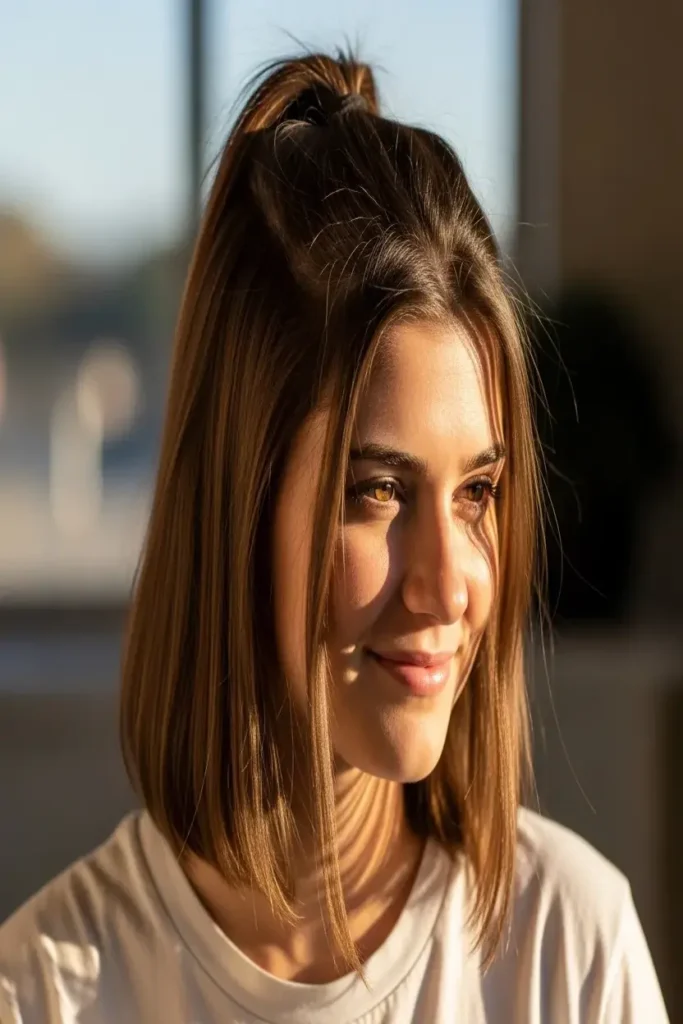 Styling a blunt shoulder length cut into a sleek ponytail highlights its sharp ends while keeping hair practical. It’s a chic and minimalistic way to showcase the cut’s precision.