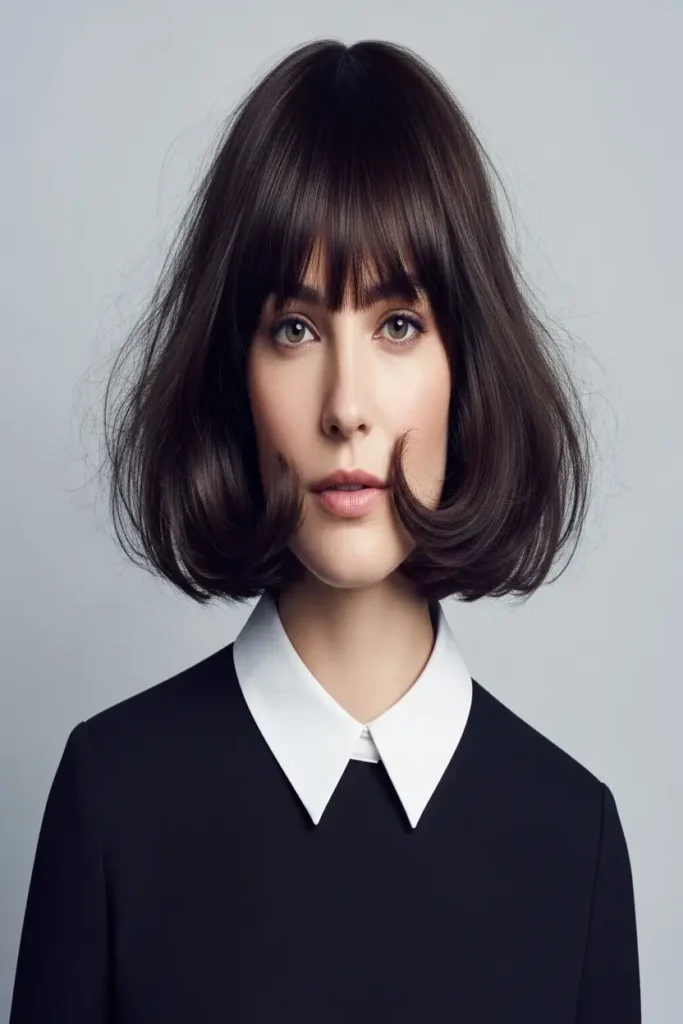 The blend of blunt edges with flowy curtain bangs makes this cut versatile. You can style it straight for a sleek, Parisian vibe or add waves for a more romantic finish. This haircut works especially well for round or oval face shapes, as the bangs elongate and slim the features.