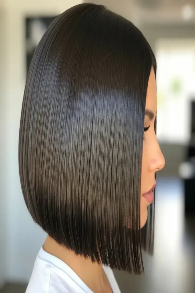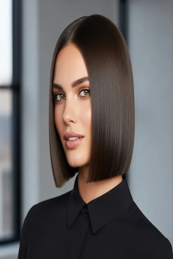 A glossy finish turns a simple blunt cut into a high-fashion statement. Shine sprays or treatments enhance the haircut’s sleekness, creating a red-carpet-ready vibe.