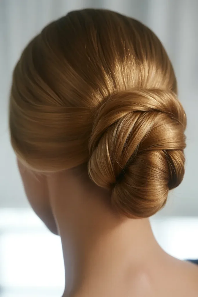 The twisted chignon is elegance personified. Divide your hair into two low sections, twist them together, and coil into a bun. Secure with pins for a refined, timeless updo.