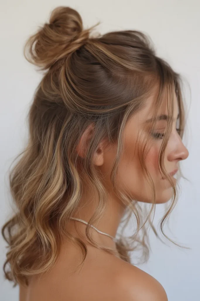 The half-up bun, or “hun,” is a playful, modern take on casual styling. Simply twist the top half of your hair into a small bun while leaving the rest flowing freely.