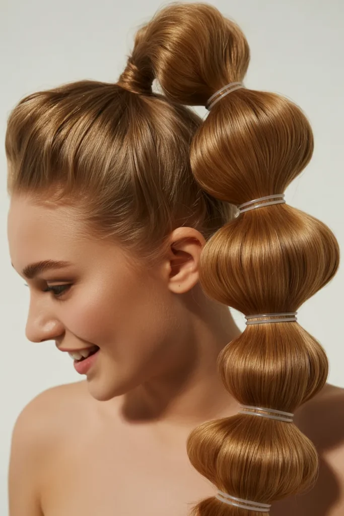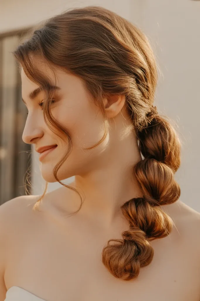 For something fun and unique, try a bubble ponytail. Tie your hair into a low or mid ponytail, then add elastics every few inches down the length, gently tugging between each one to create “bubbles.”