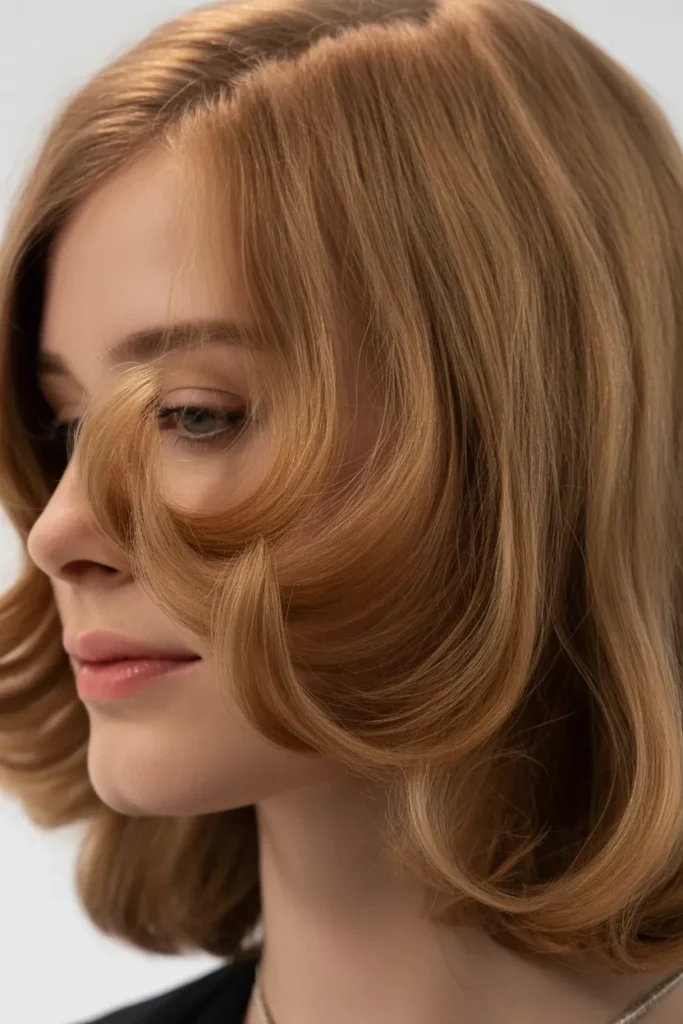 This style adds movement and bounce to medium-length hair. Pair it with a center part for a sleek ‘70s vibe or a side part for a romantic touch. It’s chic, versatile, and picture-perfect for every season.