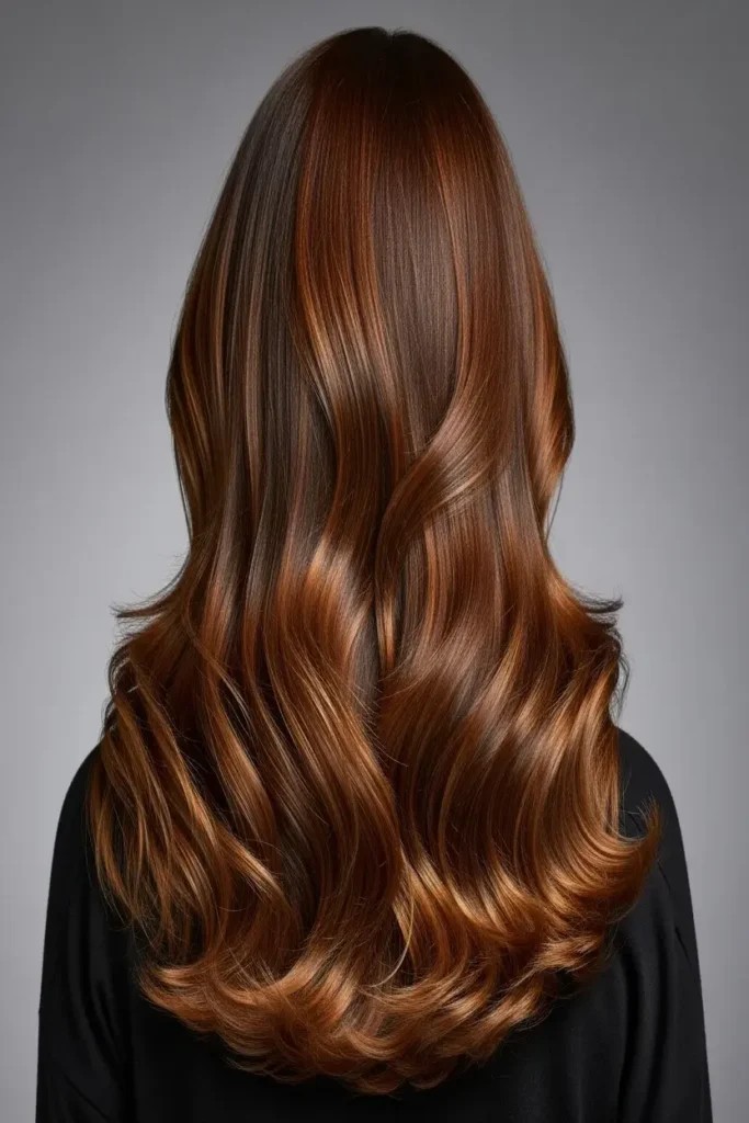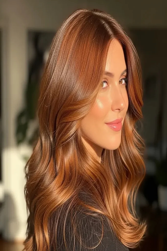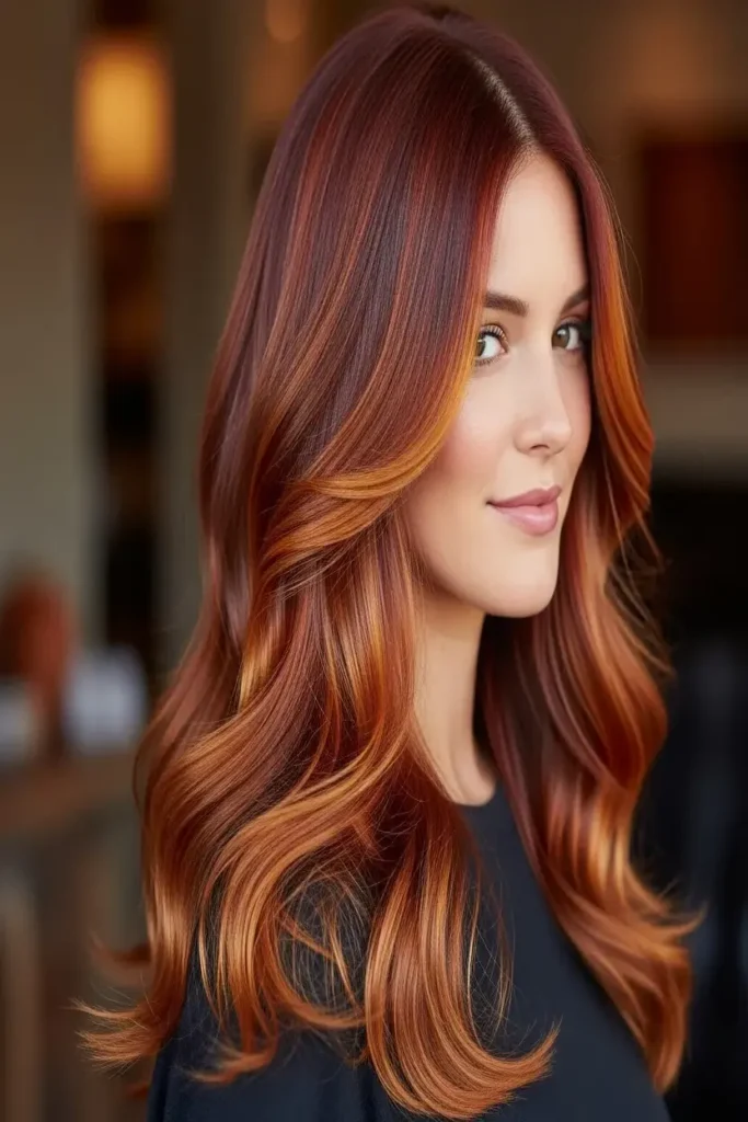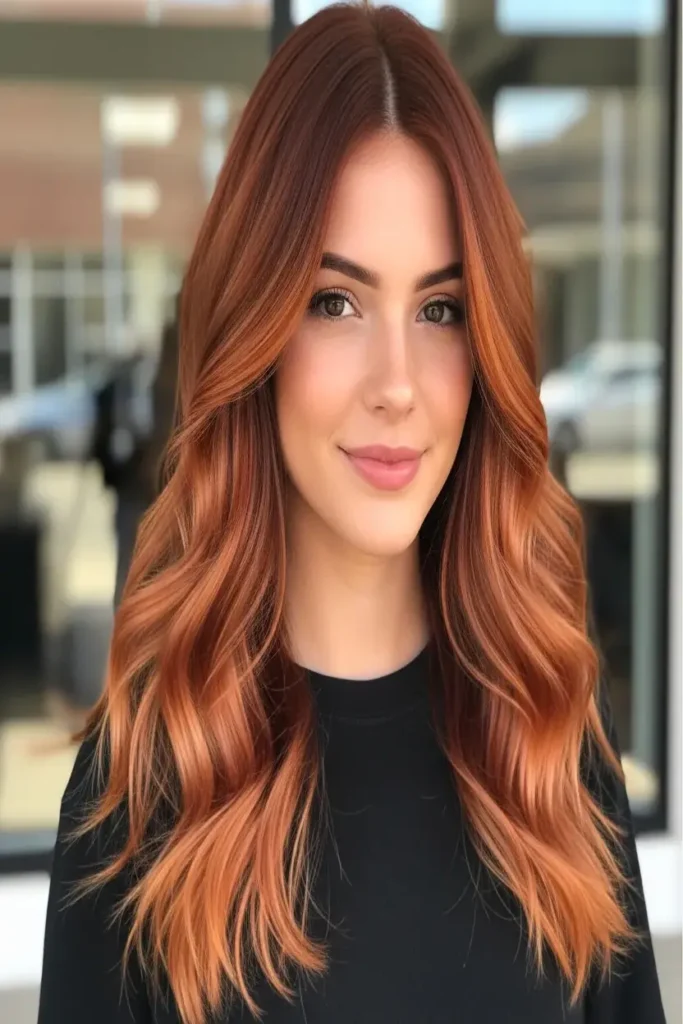 Copper balayage blends natural brunette bases with glowing copper highlights, offering a fiery but wearable style. It’s perfect for women who want a bold fall look with less frequent touch-ups.