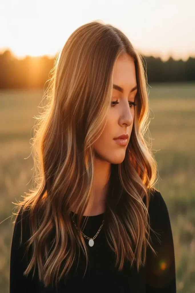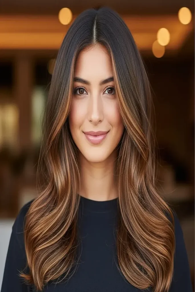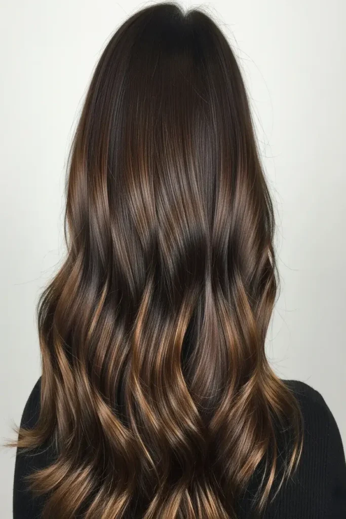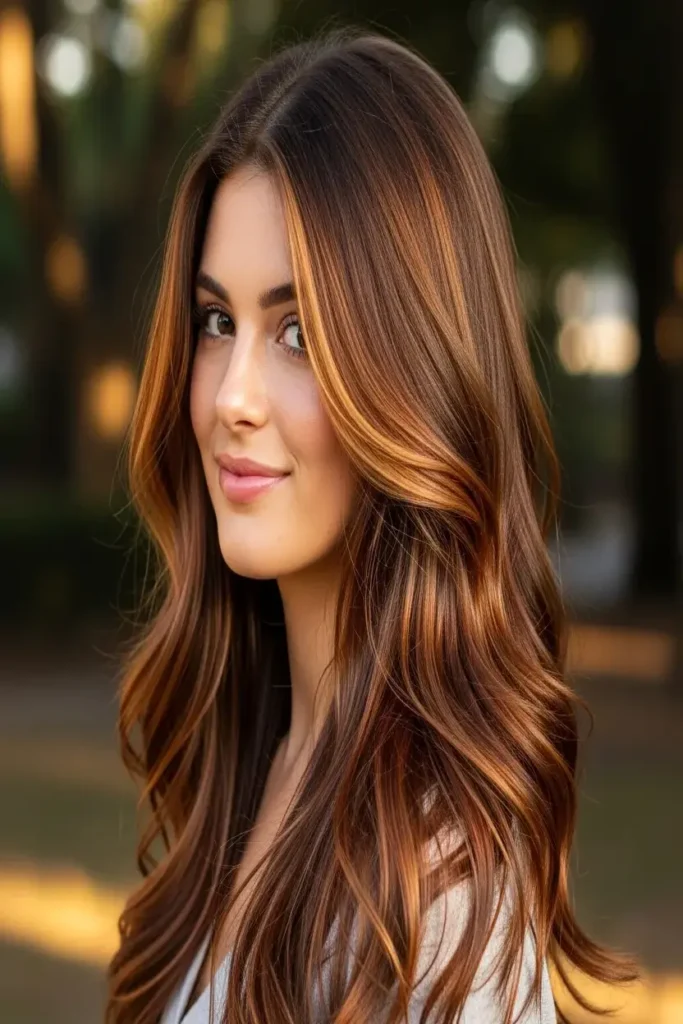Dark chocolate brown is a classic fall shade, but subtle highlights give it more depth and shine. The highlights can be caramel, honey, or golden tones, depending on your skin tone and style preference.