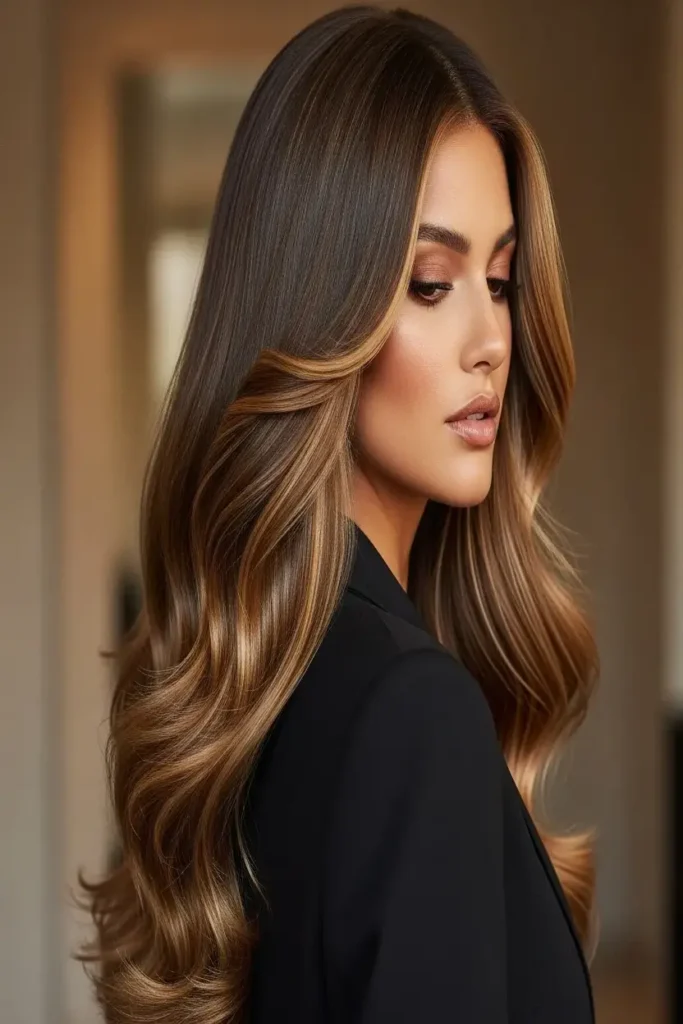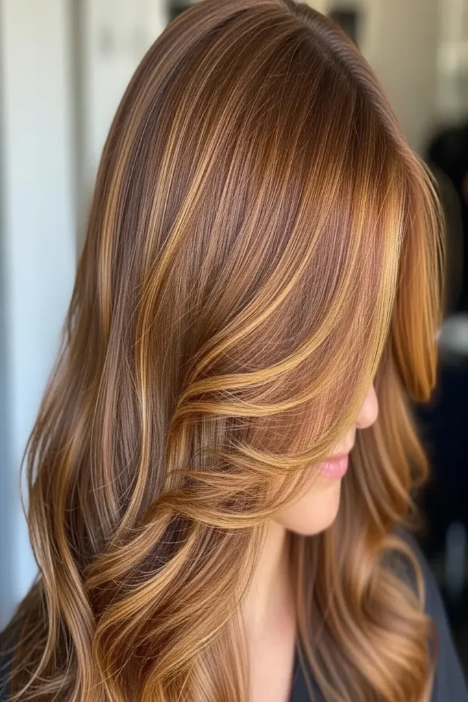 The balayage technique keeps the color soft and blended, making it ideal for long, layered hairstyles. It’s a chic and subtle option that captures autumn’s natural beauty while staying timeless.