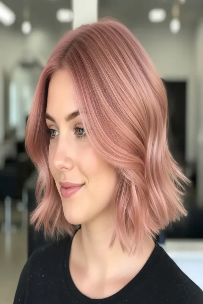 Rose gold remains a trendy hair color, and it adapts beautifully for fall with a deeper, more coppery tone. The mix of pink and gold undertones creates a chic, feminine, and slightly whimsical finish.