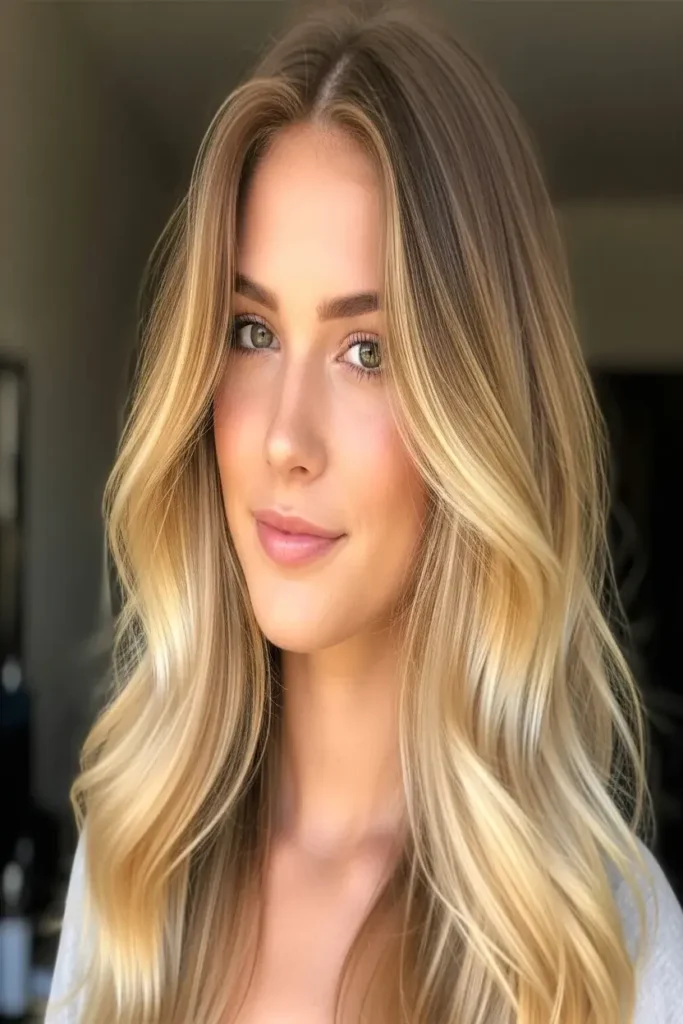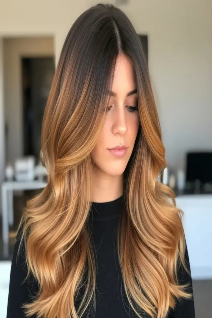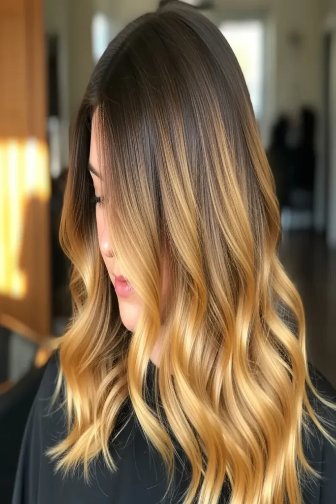 If you love blonde but want to embrace autumn vibes, a golden blonde ombre is the perfect balance. Starting with darker roots that transition into radiant golden tips, this style offers both warmth and brightness.