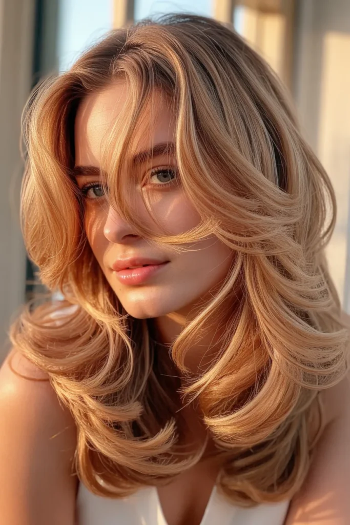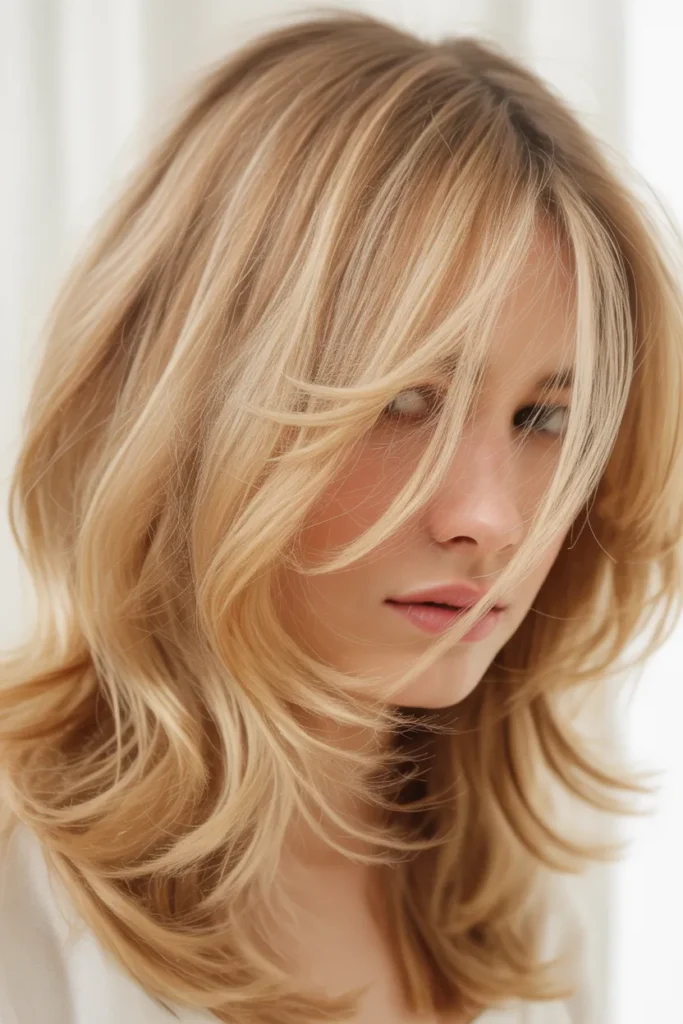Feathered cuts have made a comeback, and they’re stunning on medium blonde hair. The soft, layered texture combined with creamy blonde tones adds airiness and movement, giving your hair a light, flowy feel.