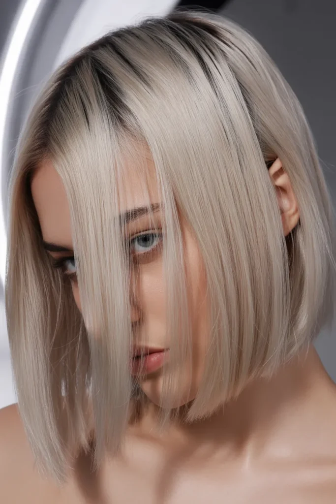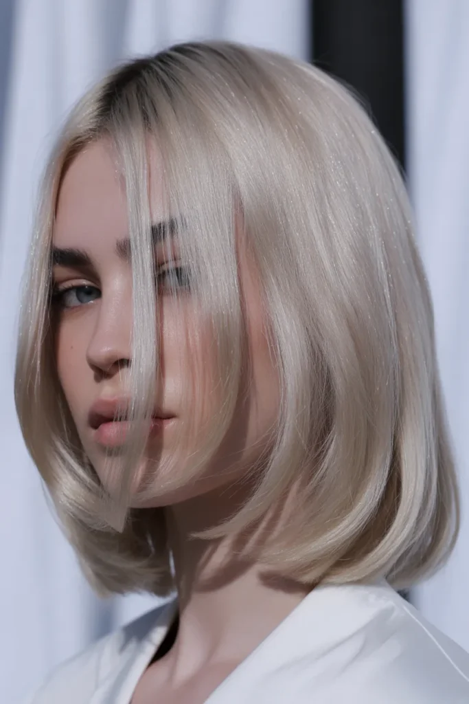 To enhance the silver undertones, use a toner or purple mask regularly. This chic, minimalist look complements both casual and professional wardrobes. It’s sleek, confident, and effortlessly modern—ideal for anyone looking to elevate their blonde game with a contemporary, fashion-forward edge.