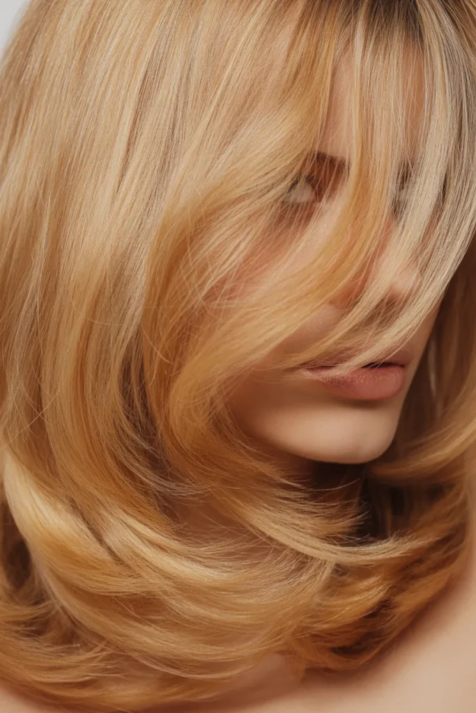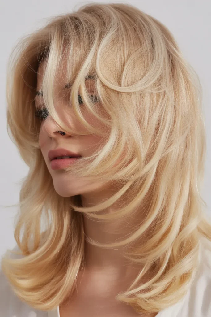 This hairstyle suits round and oval faces best, as the feathering elongates features beautifully. It’s feminine, graceful, and gives off a nostalgic yet contemporary aura. Among the 22 medium length blonde hairstyles, it’s the perfect harmony of softness and chic sophistication.