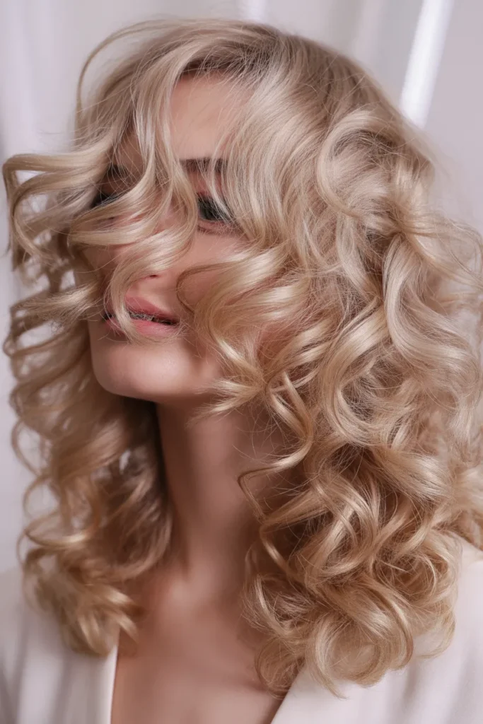 If you crave glamour, glossy pearl blonde curls deliver drama and shine. This luminous tone sparkles under light, making your curls look rich, reflective, and full of life. Medium-length hair ensures just the right amount of volume and manageability.