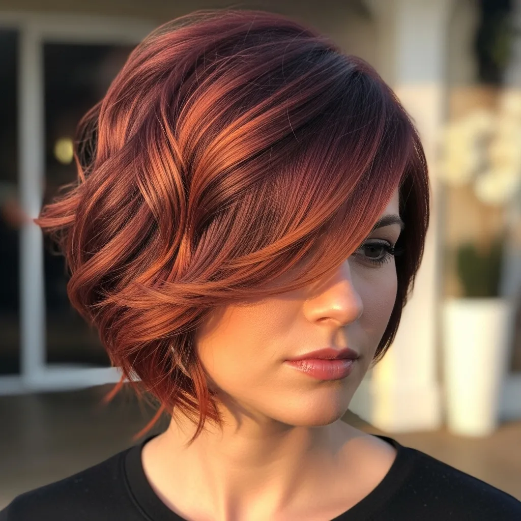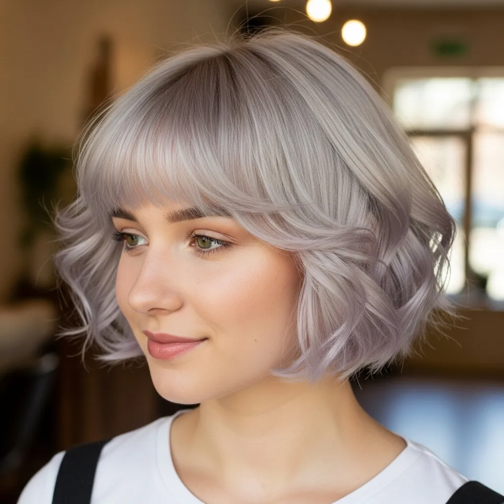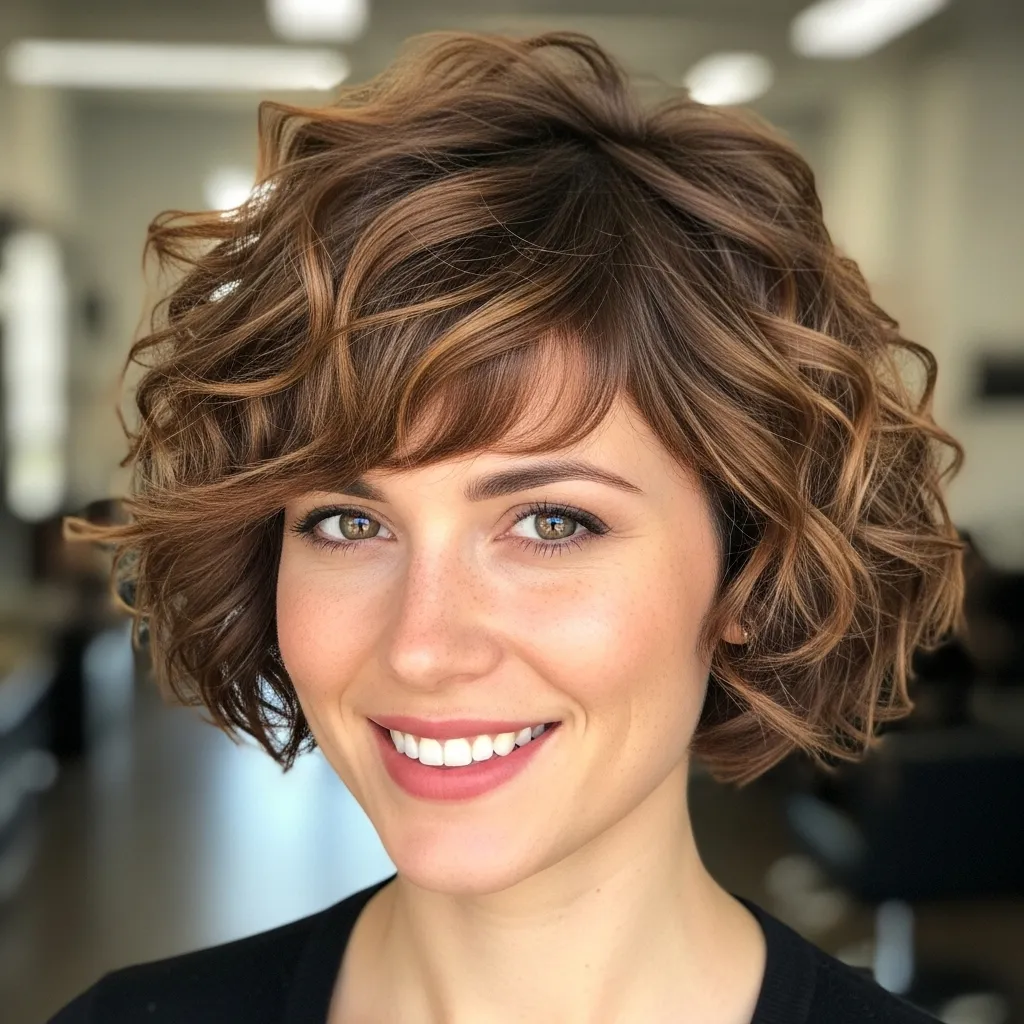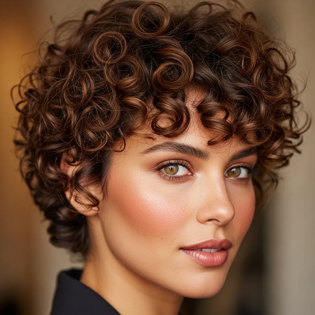 Curled bangs paired with a pixie cut create a soft, feminine look. The waves frame your face beautifully, adding charm and playfulness.